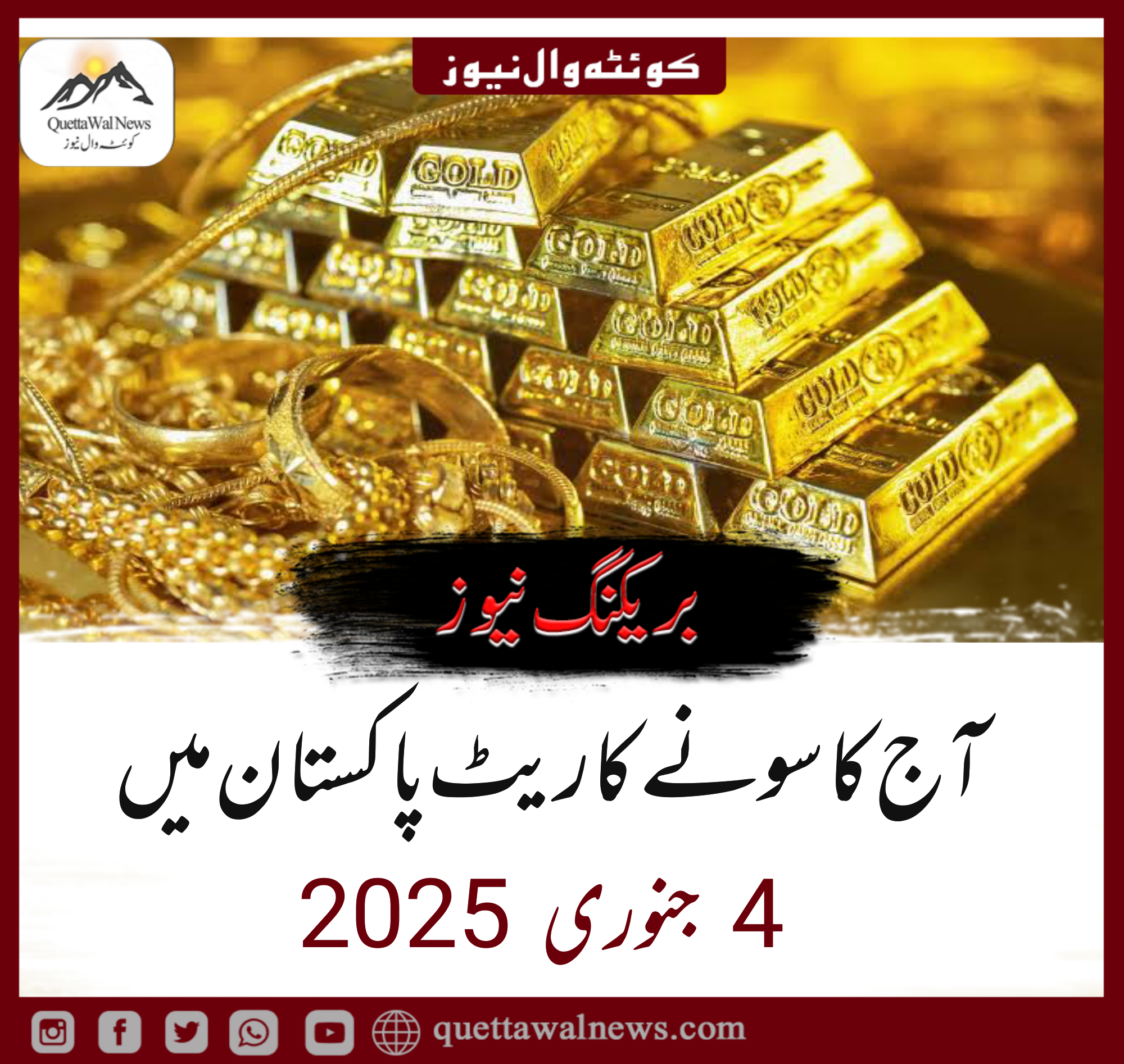 آج پاکستان میں سونے کا ریٹ 4 جنوری 2025 کے مطابق 24 قیراط فی تولہ سونے کی قیمت 2,83,900 روپے ہے، جبکہ 10 گرام سونے کی قیمت 2,43,400 روپے ہے۔