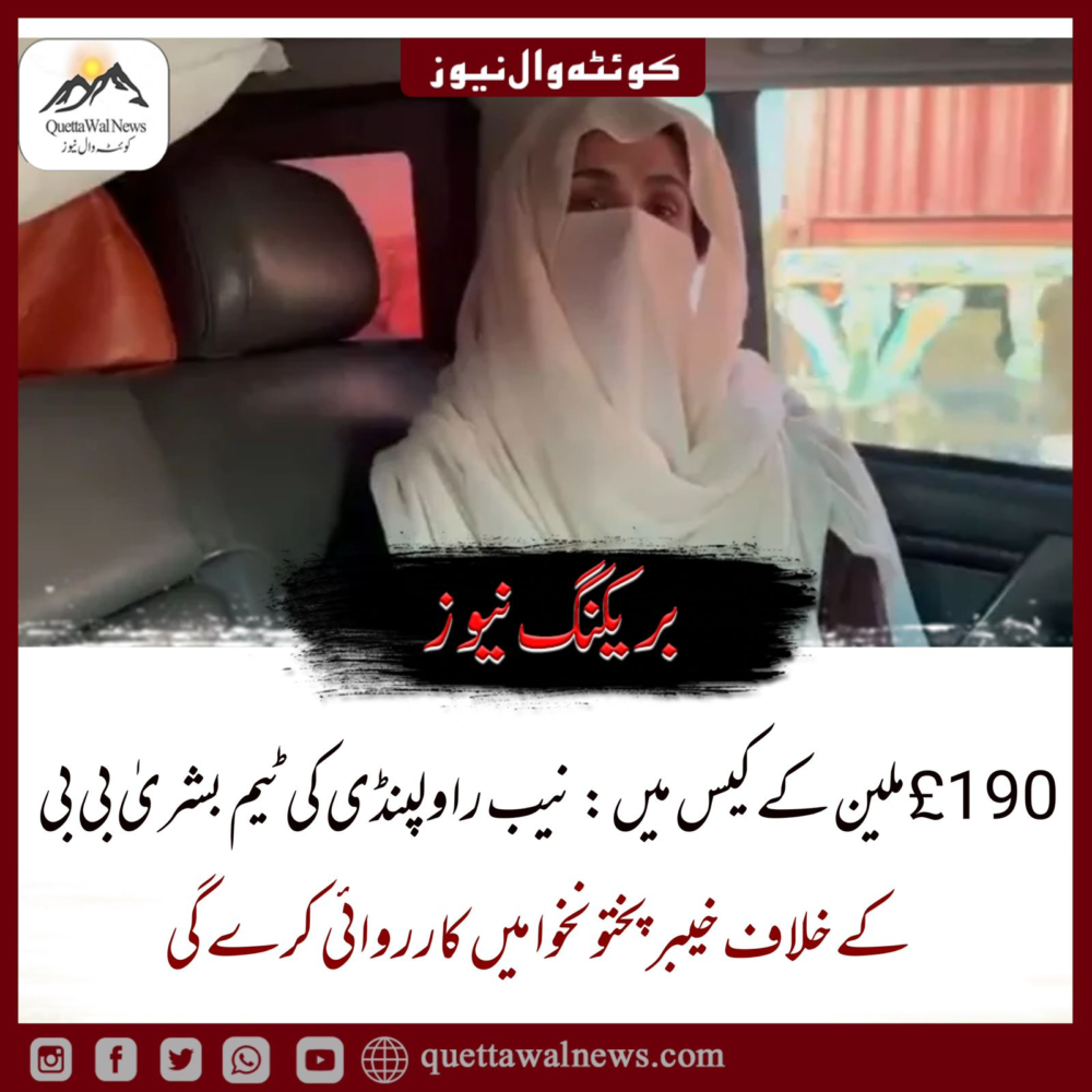 قومی احتساب بیورو (نیب) کی ایک ٹیم راولپنڈی بیورو سے £190 ملین کے کیس میں پاکستان تحریک انصاف (پی ٹی آئی) کے بانی چیئرمین عمران خان کی اہلیہ بشریٰ بی بی کو گرفتار کرنے کے لیے خیبر پختونخوا بھیجی جائے گی۔