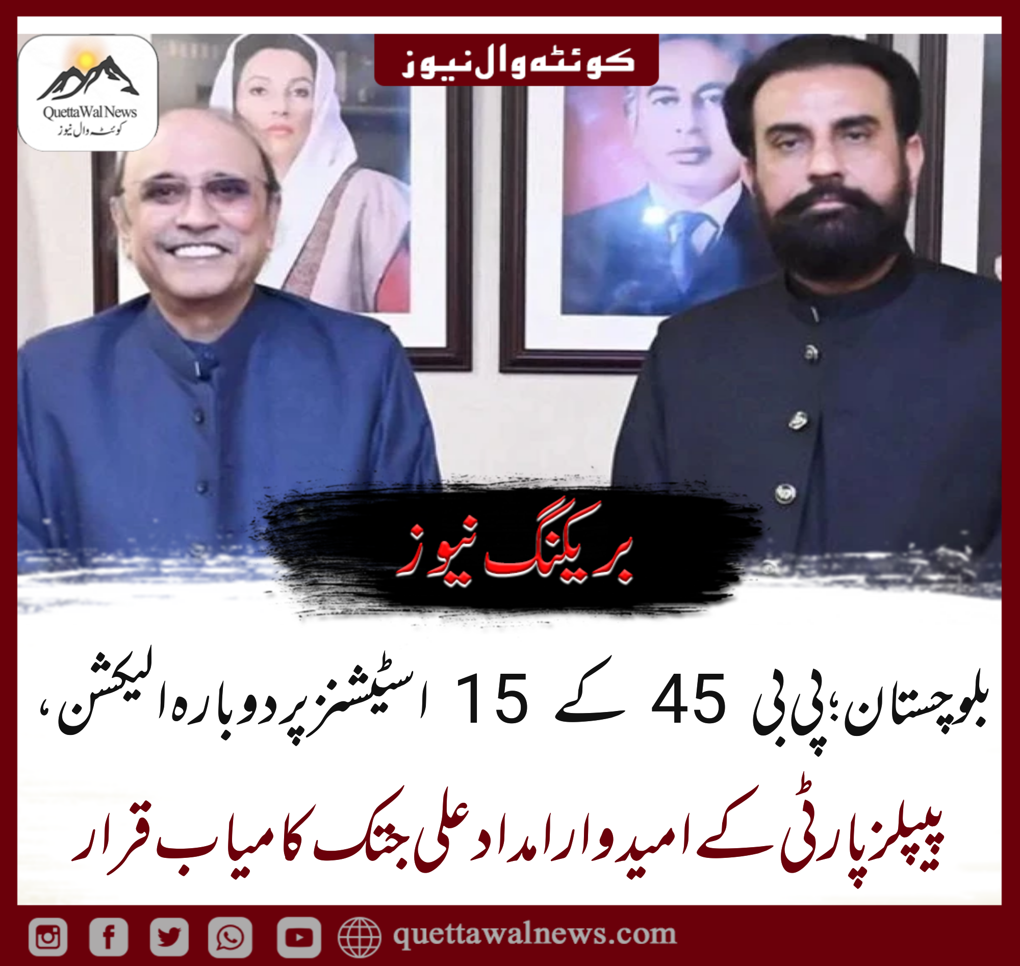 غیر حتمی غیر سرکاری نتائج کے مطابق پی بی45 کوئٹہ میں ری پولنگ پیپلزپارٹی کے امیدوار حاجی علی مدد جتک کامیاب ہوئے جبکہ پشتونخوا میپ کے امیدوارنصراللہ زیرے دوسرے نمبر پر رہے ہیں۔