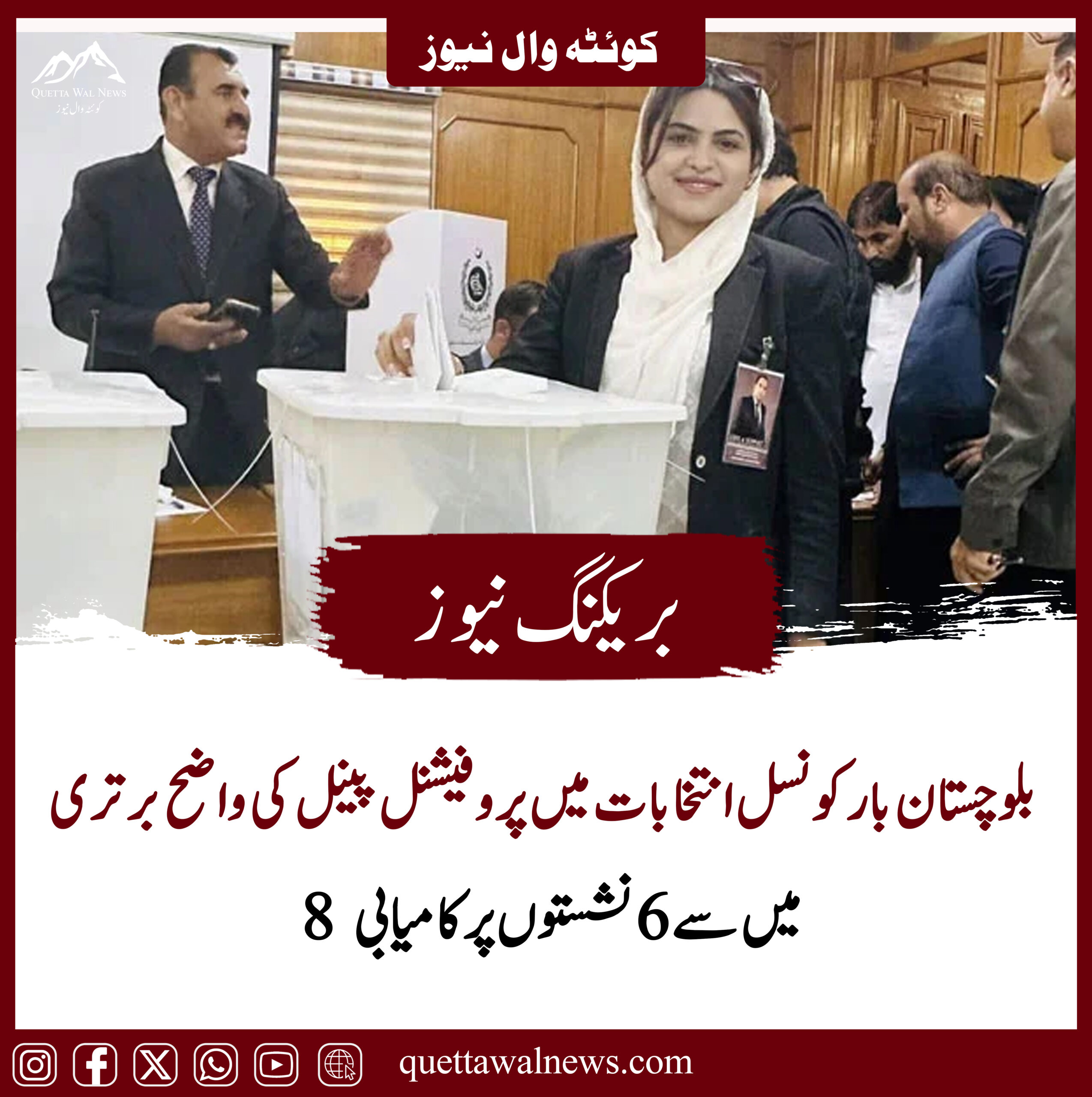 بلوچستان بار کونسل کے انتخابات میں پروفیشنل پینل نے شاندار کامیابی حاصل کرتے ہوئے 8 میں سے 6 نشستیں اپنے نام کرلیں، جبکہ انڈپنڈنٹ پینل کے 2 امیدوار کامیاب قرار پائے۔