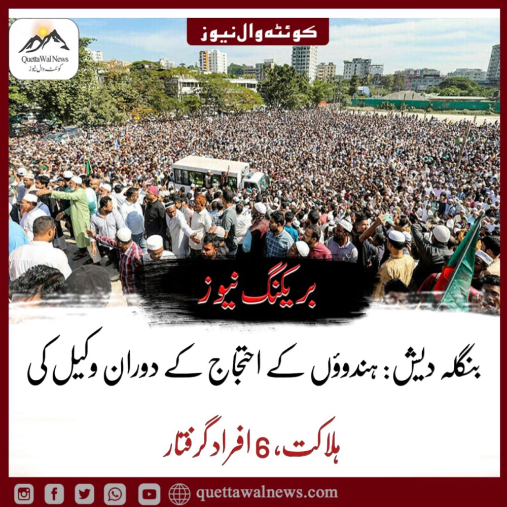 بنگلہ دیش میں ہندو مظاہرین اور سیکیورٹی فورسز کے درمیان تصادم کے نتیجے میں وکیل کی ہلاکت کے بعد پولیس نے 6 افراد کو گرفتار کرلیاخبر رساں ادارے ’اے ایف پی‘ نے حکومتی بیان کے حوالے سے بتایا کہ منگل کے روز ساحلی شہر چٹاگونگ میں توڑپھوڑ اور پولیس پر حملوں کے الزام میں 21 افراد کو حراست میں لیا گیا۔ہندو پجاری چنمئے کرشنا داس کو ایک ریلی کے دوران بنگلہ دیشی پرچم کی بے حرمتی کے الزام میں ایک روز قبل حراست میں لیا گیا تھا تاہم آج (منگل) کو ان کی ضمانت مسترد ہونے کے بعد ان کے مشتعل حامیوں اور پولیس کے درمیان تصادم ہوا۔تصادم کے دوران مظاہرین نے پتھراؤ کیا جبکہ سیکیورٹی فورسز نے آنسو گیس کے شیل فائر کیے، پولیس کے مطابق تصادم میں ایک پراسیکیوٹر ہلاک ہوگیا جس کی شناخت سیف السلام الف کے نام سے ہوئی۔