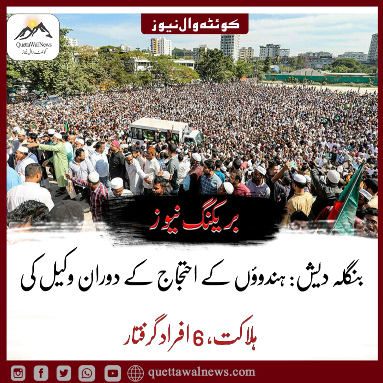 بنگلہ دیش میں ہندو مظاہرین اور سیکیورٹی فورسز کے درمیان تصادم کے نتیجے میں وکیل کی ہلاکت کے بعد پولیس نے 6 افراد کو گرفتار کرلیاخبر رساں ادارے ’اے ایف پی‘ نے حکومتی بیان کے حوالے سے بتایا کہ منگل کے روز ساحلی شہر چٹاگونگ میں توڑپھوڑ اور پولیس پر حملوں کے الزام میں 21 افراد کو حراست میں لیا گیا۔ہندو پجاری چنمئے کرشنا داس کو ایک ریلی کے دوران بنگلہ دیشی پرچم کی بے حرمتی کے الزام میں ایک روز قبل حراست میں لیا گیا تھا تاہم آج (منگل) کو ان کی ضمانت مسترد ہونے کے بعد ان کے مشتعل حامیوں اور پولیس کے درمیان تصادم ہوا۔تصادم کے دوران مظاہرین نے پتھراؤ کیا جبکہ سیکیورٹی فورسز نے آنسو گیس کے شیل فائر کیے، پولیس کے مطابق تصادم میں ایک پراسیکیوٹر ہلاک ہوگیا جس کی شناخت سیف السلام الف کے نام سے ہوئی۔
