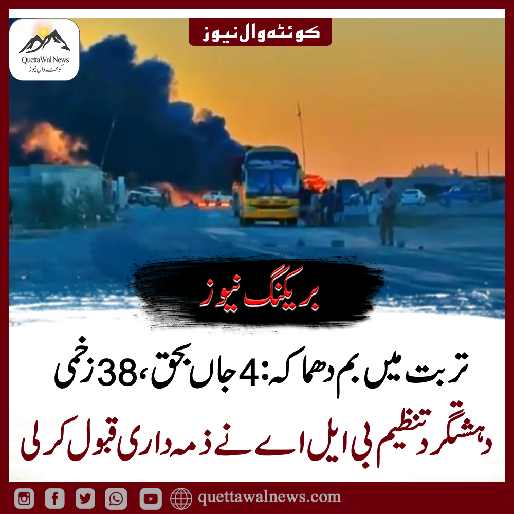 بلوچستان کے شہر تربت میں ایک افسوسناک بم دھماکہ پیش آیا، جس میں 4 افراد جاں بحق اور 38 زخمی ہو گئے۔ دھماکہ سڑک کنارے ہوا، جس کی زد میں ایک بس آ گئی۔ زخمیوں میں پانچ کی حالت تشویش ناک بتائی جا رہی ہے۔
