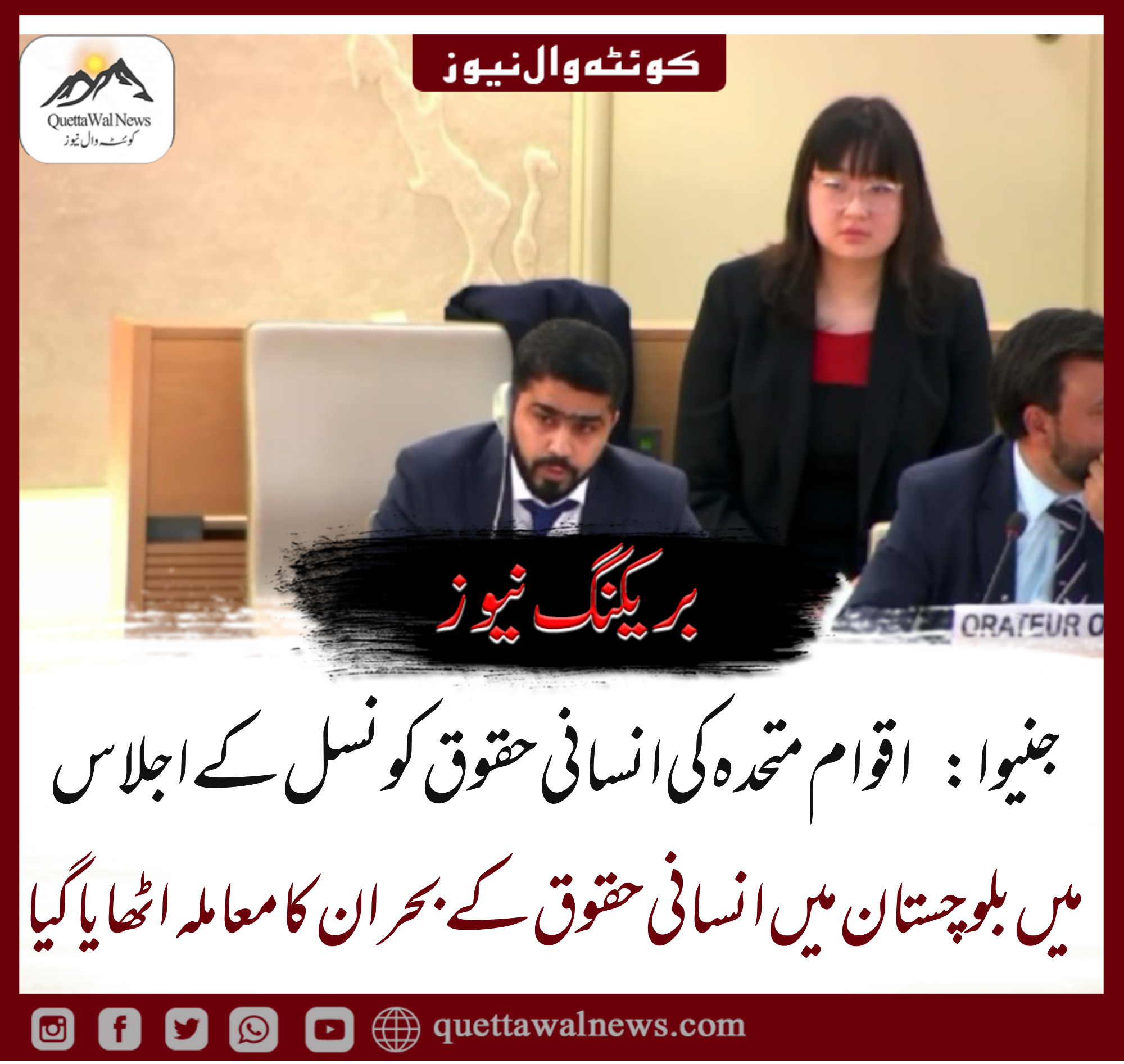 نیاز بلوچ، بلوچ نیشنل موومنٹ (بی این ایم) کے فارن ڈیپارٹمنٹ کے کوآرڈینیٹر اور مرکزی کمیٹی کے رکن نے جنیوا میں 58 ویں سیشن آف دی یونائیٹڈ نیشنز ہیومن رائٹس کونسل (یو این ایچ آر سی) کے دوران بلوچستان میں انسانی حقوق کی سنگین صورتحال پر روشنی ڈالی۔