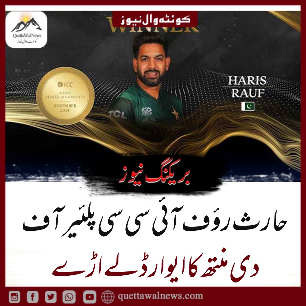قومی فاسٹ باؤلر حارث رؤف نے انٹرنینشل کرکٹ کونسل ( آئی سی سی ) پلئیر آف دی منتھ نومبر کا ایوارڈ اپنے نام کرلیا۔