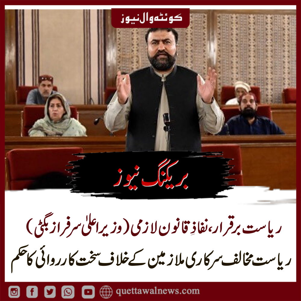 وزیر اعلیٰ بلوچستان میر سرفراز بگٹی نے حکومتی پالیسیاں نافذ کرنے کے لیے سخت اقدامات کا اعلان کر دیا! ⚖️ حکومت بلوچستان نے ریاست مخالف سرگرمیوں میں ملوث سرکاری ملازمین کے خلاف کریک ڈاؤن کا حکم دے دیا ہے۔ تمام کمشنرز اور ڈپٹی کمشنرز کو ہدایت جاری کر دی گئی ہے کہ وہ ایسے ملازمین کی نشاندہی کریں جو ریاست کے خلاف پروپیگنڈا کر رہے ہیں یا تخریبی سرگرمیوں میں ملوث ہیں۔