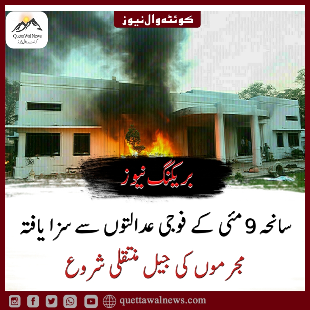 سانحہ 9 مئی کے مقدمات میں سزا یافتہ مجرموں کی فوجی عدالتوں سے سنائی گئی سزاؤں کے بعد جیل منتقلی کا عمل شروع کر دیا گیا ہے، اور ابتدائی طور پر 11 مجرموں کو لاہور کی کوٹ لکھپت جیل منتقل کیا گیا ہے۔ یہ مجرم مختلف مدت کی قید بامشقت کی سزائیں کاٹیں گے، جو انہیں فوجی عدالتوں نے ملک کے حساس اداروں اور املاک پر حملوں کے جرم میں سنائی ہیں۔