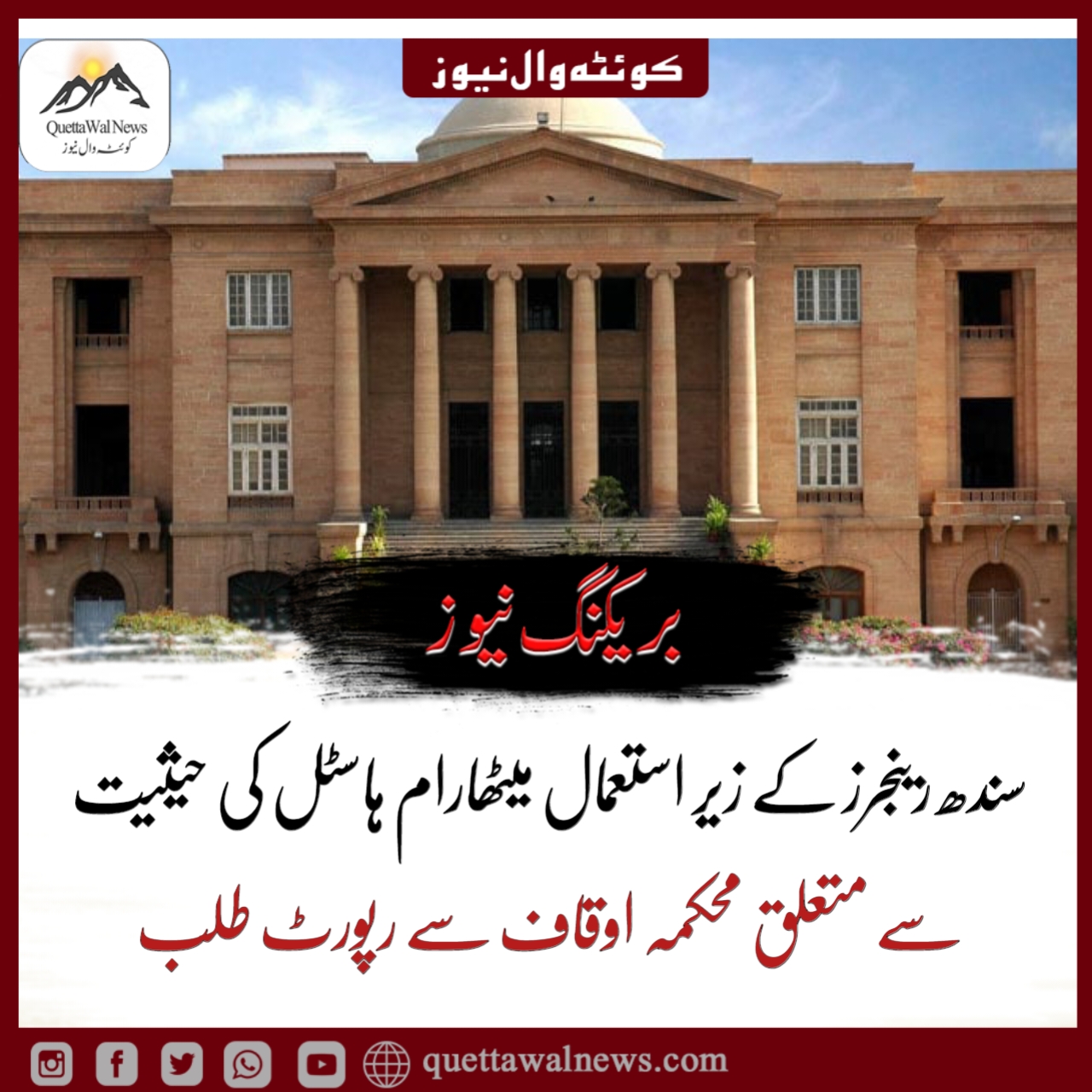 کراچی: سندھ ہائیکورٹ نے محکمہ اوقاف سے رینجرز کے زیر استعمال میٹھارام ہاسٹل کی حیثیت سے متعلق رپورٹ طلب کرلی ۔