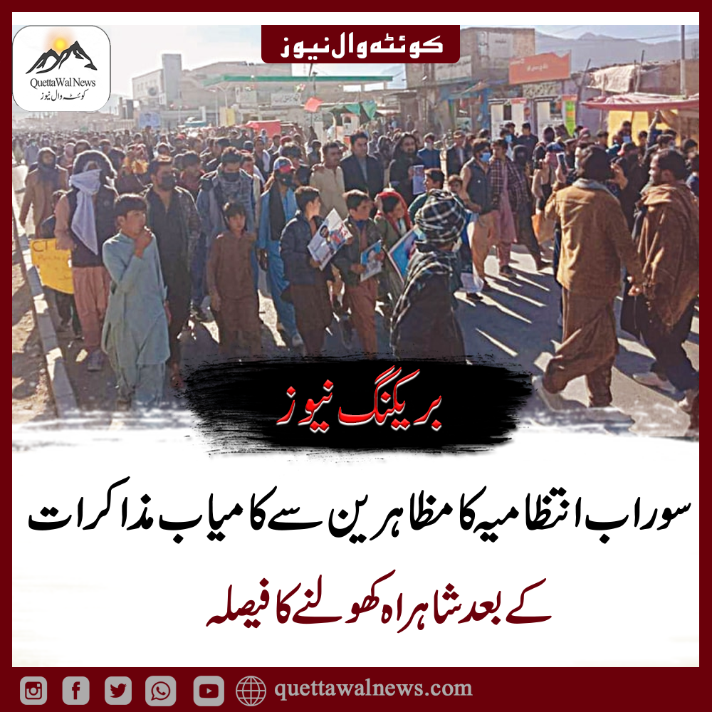 سوراب: سوراب انتظامیہ نے مظاہرین کے ساتھ کامیاب مذاکرات کے بعد کوئٹہ کراچی شاہراہ کو ٹریفک کے لئے کھول دیا ہے۔ شاہراہ کو بلاک کرنے کی وجہ سے عوام کو شدید مشکلات کا سامنا تھا، لیکن انتظامیہ نے مظاہرین کے مطالبات پر غور کے بعد ٹریفک کی بحالی کو ممکن بنایا۔ شاہراہ پر ٹریفک دوبارہ معمول کے مطابق چلنے لگی ہے، اور عوام نے اس فیصلے کو خوش آئند قرار دیا ہے۔
