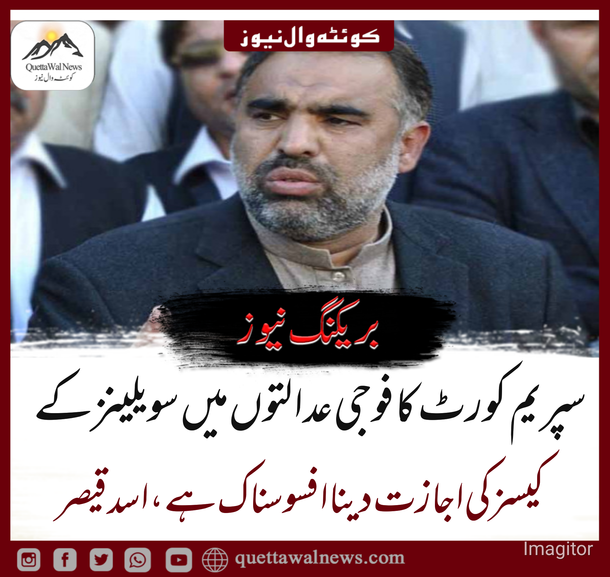 پی ٹی آئی رہنما اسد قیصر نے کہا ہے کہ سپریم کورٹ کی جانب سے فوجی عدالتوں میں سویلینز کے کیسز کی اجازت دینا افسوسناک ہے۔