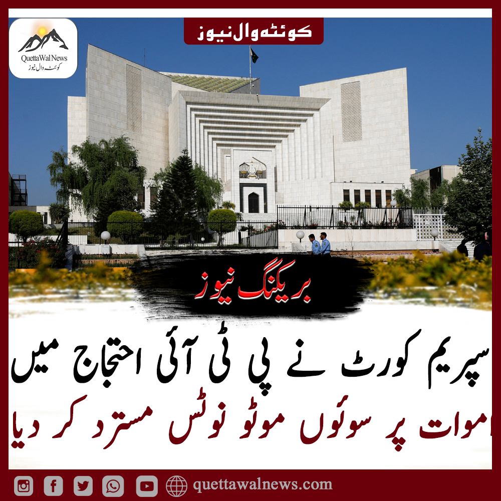 سپریم کورٹ نے پی ٹی آئی کے احتجاج میں ہونے والی اموات کے حوالے سے خیبر پختونخوا کے ایڈیشنل ایڈووکیٹ جنرل کی سوئوں موٹو نوٹس لینے کی درخواست مسترد کر دی۔ ججز نے سیاسی بیانات دینے سے گریز کی ہدایت کی، جبکہ عدالت نے کہا کہ یہ معاملہ عدالت کے دائرہ اختیار سے باہر ہے۔ پی ٹی آئی کا دعویٰ ہے کہ ان کے آٹھ کارکن احتجاج کے دوران جاں بحق ہوئے، جبکہ حکومت نے تین رینجرز اور دو پولیس اہلکاروں کی شہادت کی تصدیق کی ہے۔