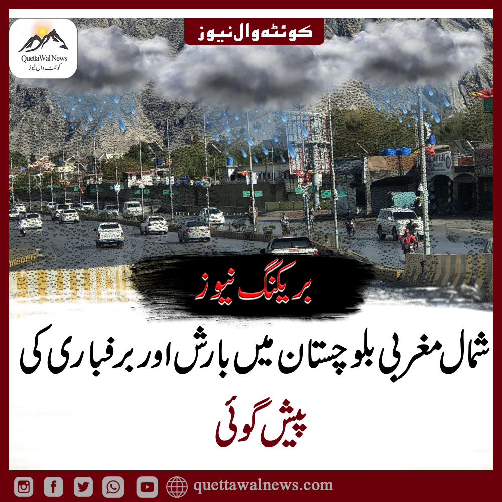 محکمہ موسمیات نے شمال مغربی بلوچستان کے علاقوں، جن میں کوئٹہ، چمن، زیارت، پشین، اور قلعہ عبداللہ شامل ہیں، میں آئندہ چند روز کے دوران ہلکی بارش اور برفباری کی پیش گوئی کی ہے۔ بالائی علاقوں میں شدید سردی کے باعث درجہ حرارت میں نمایاں کمی کا امکان ہے۔