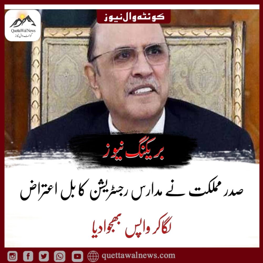 اسلام آباد: صدر مملکت آصف زرداری نے مدارس رجسٹریشن کا بل اعتراض لگاکر واپس بھجوادیا۔