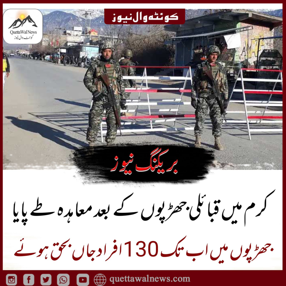 حکومت کی جانب سے خیبر پختونخوا کے ضلع کرم میں کشیدگی کم کرنے کی کوششوں کے تحت دو متحارب قبائل کے درمیان جنگ بندی طے پا گئی، ڈپٹی کمشنر نے اتوار کو تصدیق کی۔ خونریز جھڑپوں میں ہلاکتوں کی تعداد 130 تک پہنچ گئی ہے۔