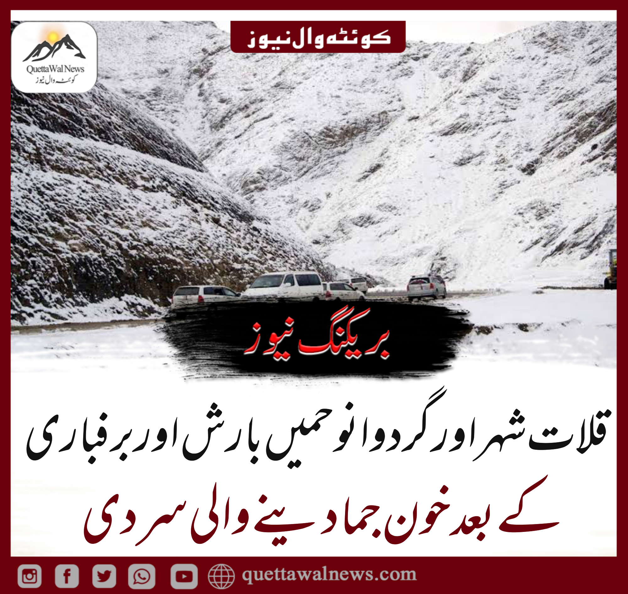 قلات شہر اور گردونواح میں گزشتہ روز کی بارش اور برف باری کے بعد خون جمادینی والی سردی میں تیزی آگئی ہے محکمہ موسمیات کے مطاگزشتہ 24 گھنٹوں کے دوران قلات میں کم سے کم درجہ حرارت منفی 9 ریکارڈ کیا گیا ہے شدید سردی کی وجہ سے پانی کے ٹینکس اور پائپس ٹوٹنے گے سڑکوں نا لیوں تالابوں میں کھڑا پانی جم گیا کوئٹہ کراچی شاہراہ پر چلنے والی گاڑیاں ایئر لاک ہوگئے شدید سردی میں سوئی گیس مکمل غائب اور بجلی کی طویل غیر اعلانیہ لوڈشیڈنگ سے معمولات زندگی بری طرح متاثر ہوگئی ہے شہر میں سوختنی لکڑی بھی ناپید ہو چکی ہے شہری ایل پی جی گیس مہنگے داموں خرید نے پر مجبور ہیں شدید سردی کی وجہ سے قلات کے شہری شدید سردی میں سوئی گیس کی بندش بجلی کی طویل اٹھارہ گھنٹوں کی لوڈ شیڈنگ پر حکومت سے ناخوش ہوگئے شہر یوں کا کہنا ہے کہ حکومت نے شدید سردی میں قلات عوام کو شدید رحم وکرم پر چھوڑ دیا ہے ۔