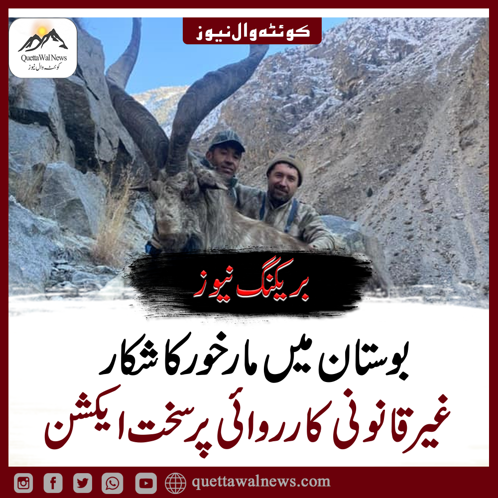 کوئٹہ، 3 جنوری 2025: بوستان کے انڈسٹریل زون کے عقب میں جیپ سے شکار کیا گیا مارخور برآمد ہوا۔ محکمہ جنگلی حیات کے پروجیکٹ ڈائریکٹر نیاز کاکڑ کے مطابق مارخور کے غیر قانونی شکار کے الزام میں اظہار خان، مصور خان، اور صدام خان کو گرفتار کر لیا گیا ہے۔