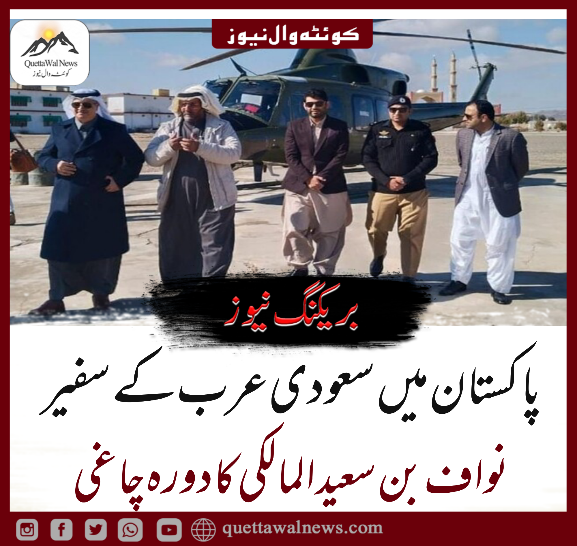 پاکستان میں سعودی عرب کے سفیر نواف بن سعید المالکی نے بلوچستان کے علاقے چاغی کا دورہ کیا۔ ڈپٹی کمشنر چاغی عطا المنیم نے سنیچر کو حکومت بلوچستان کی ہدایت پر سعودی سفیر کا چاغی پہنچے پر استقبال کیا۔