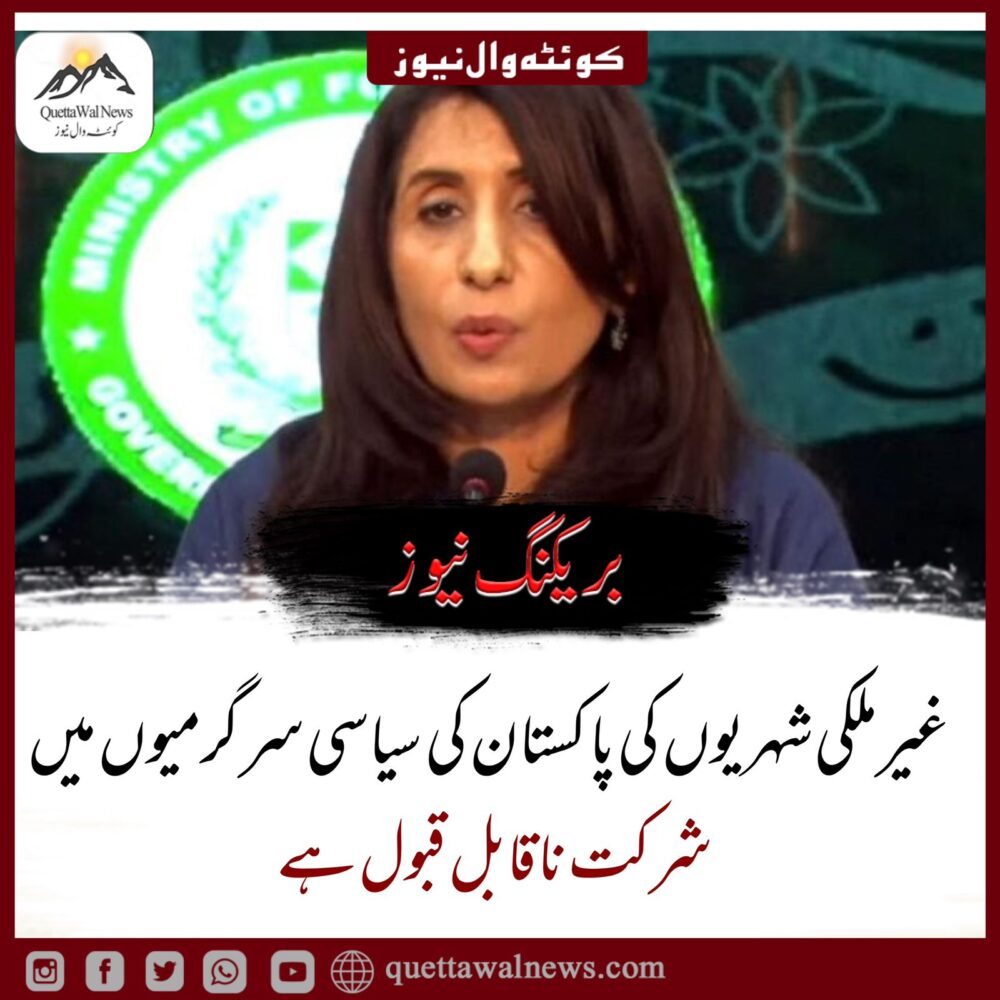 دفتر خارجہ کی ترجمان ممتاز زہرا بلوچ نے جمعہ کے روز کہا کہ پاکستان میں کسی بھی سیاسی سرگرمی میں غیر ملکی شہریوں کی شرکت غیر قانونی اور ناقابل قبول ہے۔