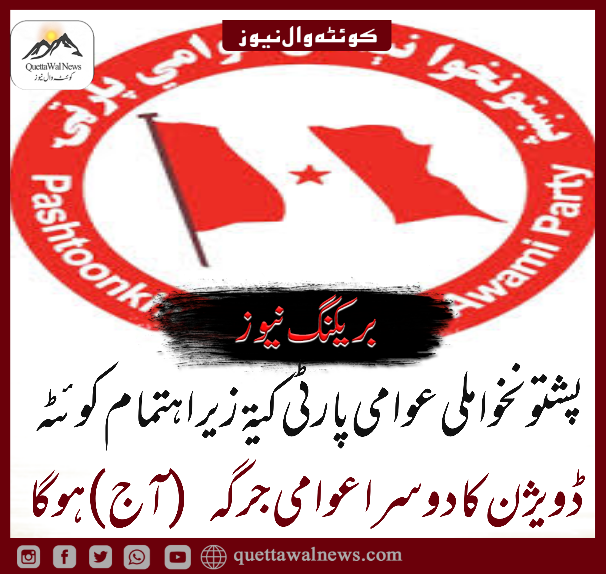 پشتونخواملی عوامی پارٹی کے صوبائی سیکرٹریٹ کے جاری کردہ پریس ریلیز میں کہا گیا ہے کہ پشتون قومی جرگے بنوں11تا14مارچ 2022 کے اعلامیہ کی روشنی میں پشتونخواملی عوامی پارٹی کے چیئرمین محمود خان اچکزئی کی دعوت پر کوئٹہ ڈویژن کا دوسرا عوامی جرگہ (آج)پیرکو چمن ماسٹر پلان میں منعقد ہوگا۔جس کی صدارت پارٹی کے مرکزی سیکرٹری نواب محمد ایاز خان جوگیزئی کرینگے۔