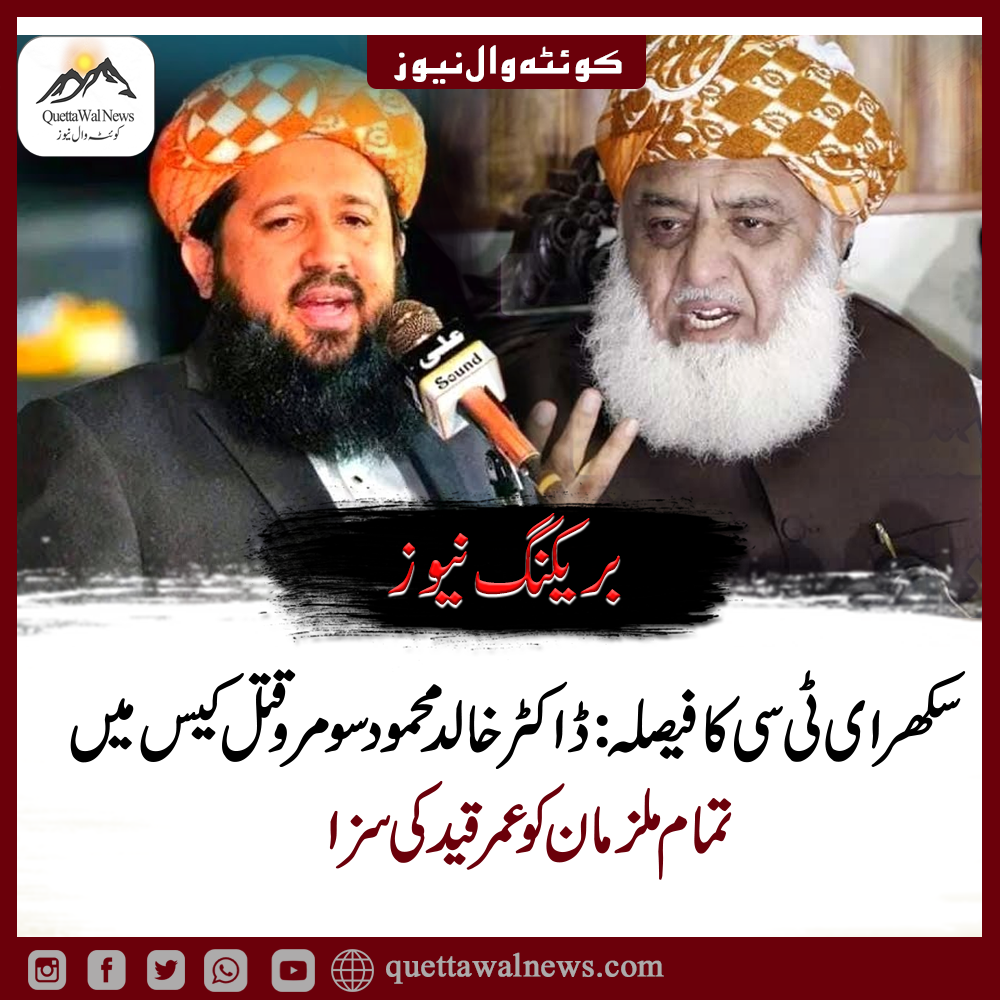 سکھر: سکھر کی انسداد دہشت گردی عدالت (ای ٹی سی) نے جمعیت علمائے اسلام (جے یو آئی) کے رہنما ڈاکٹر خالد محمود سومرو کے قتل کیس میں ملزمان کے خلاف محفوظ فیصلہ سنایا۔ عدالت نے تمام چھ ملزمان کو قتل اور دہشت گردی کے الزامات میں عمر قید اور بھاری جرمانے کی سزا دی۔