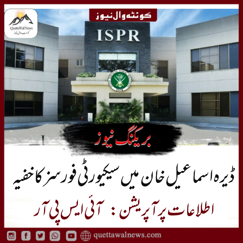 سیکیورٹی فورسز نے ڈیرہ اسماعیل خان میں خفیہ اطلاعات پر کامیاب آپریشن کرتے ہوئے 2 خوارجیوں کو ہلاک جبکہ ایک کو زخمی حالت میں گرفتار کر لیا ۔