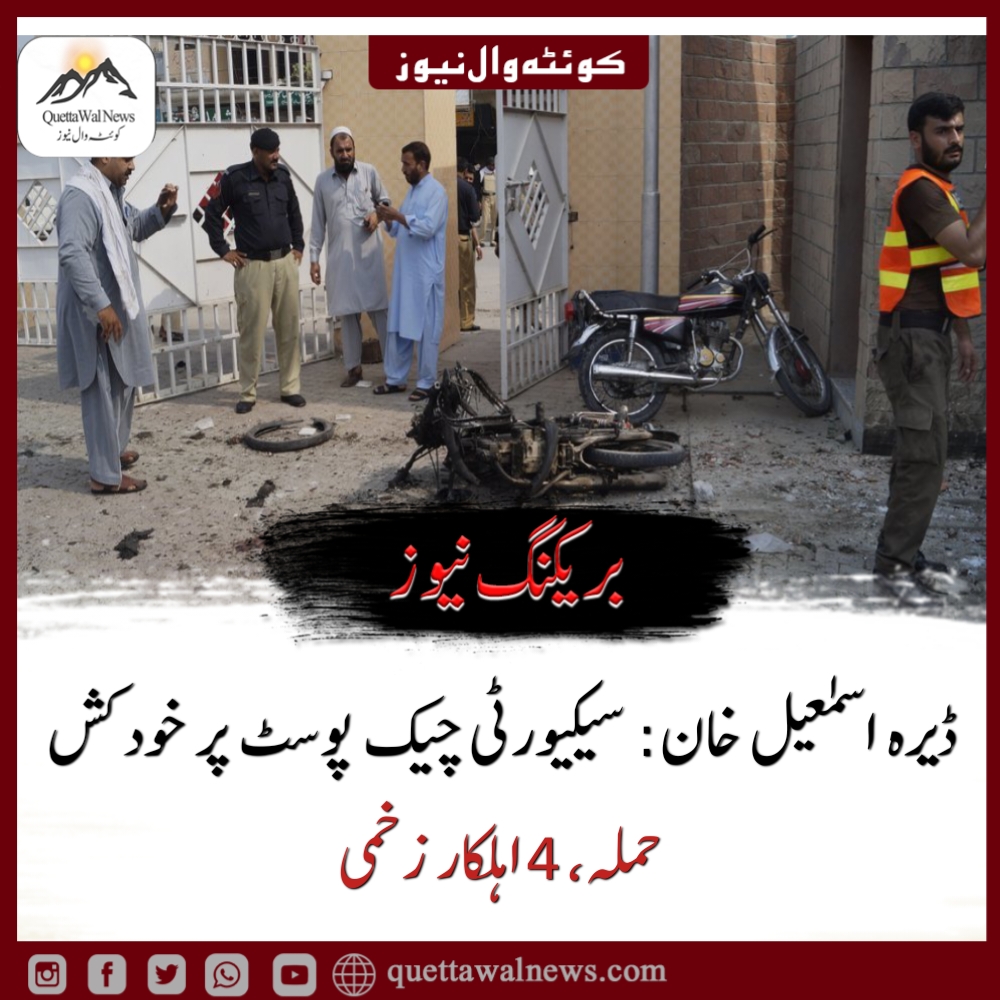 ڈیرہ اسماعیل خان کے علاقے کلاچی میں ڈیرہ-ٹانک روڈ پر پولیس اور سیکیورٹی فورسز کی مشترکہ چوکی پر ہونے والے خودکش حملے میں 4 سیکیورٹی اہلکار زخمی ہوگئے ہیں، جبکہ چوکی کو شدید نقصان پہنچا۔ یہ واقعہ کنوری پوسٹ پر پیش آیا، جہاں ایک خودکش بمبار نے گاڑی کے ذریعے چوکی کو نشانہ بنایا۔