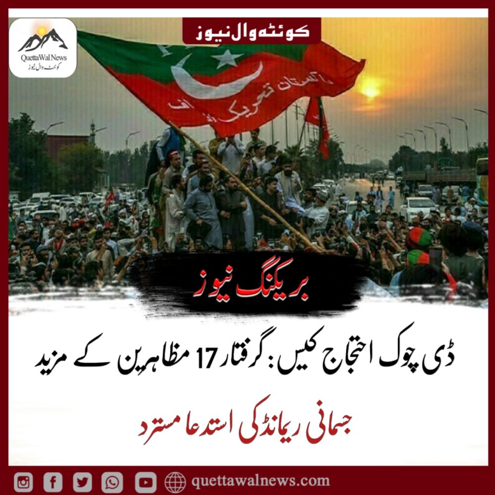 اسلام آباد میں انسداد دہشتگردی کی خصوصی عدالت نے ڈی چوک میں پاکستان تحریک انصاف کے احتجاج کے بعد گرفتار 17 ملزمان کے جسمانی ریمانڈ کی استدعا مسترد کرتے ہوئے انہیں جوڈیشل ریمانڈ پر جیل بھیج دیا۔