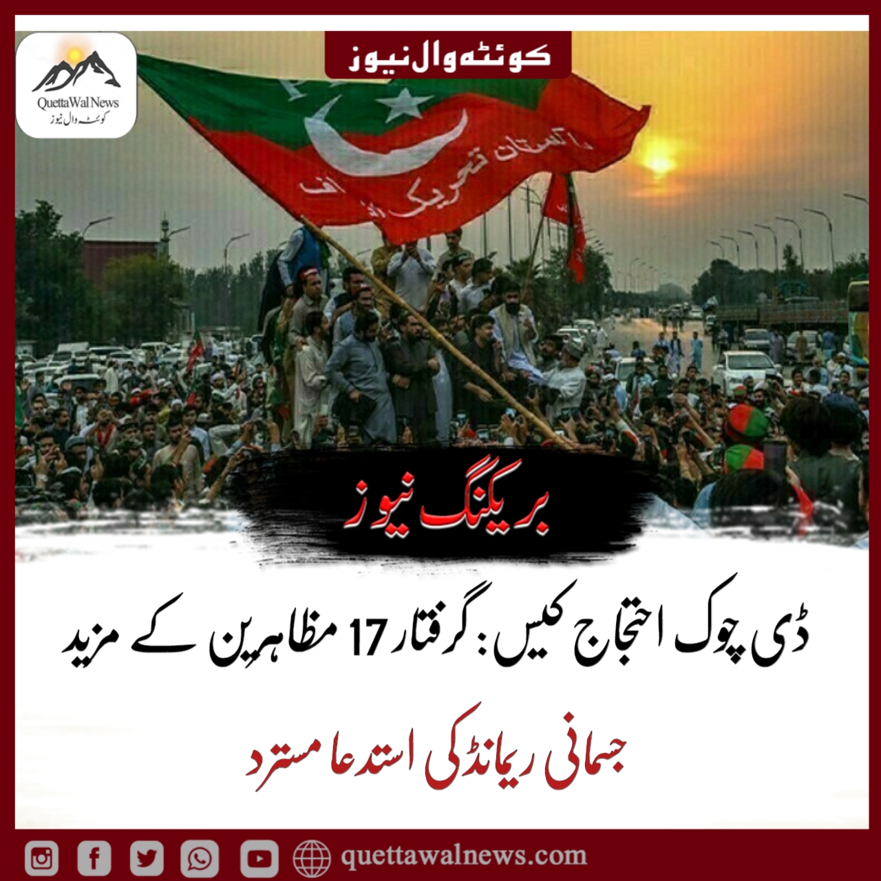 اسلام آباد میں انسداد دہشتگردی کی خصوصی عدالت نے ڈی چوک میں پاکستان تحریک انصاف کے احتجاج کے بعد گرفتار 17 ملزمان کے جسمانی ریمانڈ کی استدعا مسترد کرتے ہوئے انہیں جوڈیشل ریمانڈ پر جیل بھیج دیا۔