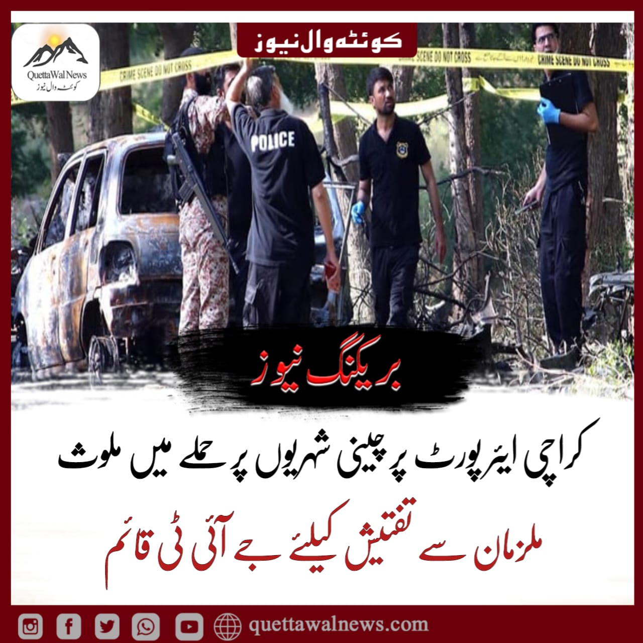 تفصیلات کے مطابق کراچی ایئرپورٹ پر چینی شہریوں کے حملے میں ملوث ملزمان سے تفتیش کیلئے جے آئی ٹی قائم کردی گئی ، گرفتار ملزم محمد جاوید ولد لال محمد اور گل نساء دختر کریم جان سے 8 رکنی جے آئی ٹی تفتیش کرے گی۔