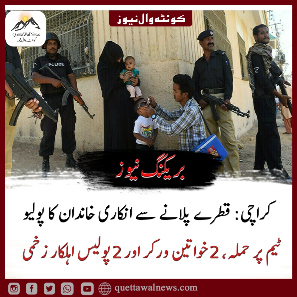 کراچی کے علاقے کورنگی میں بچوں کو پولیو سے بچاؤ کے قطرے پلانے سے انکاری قبائلی خاندان نے انسداد پولیو ٹیم پر بیلچوں سے حملہ کردیا، واقعے میں 2 خواتین پولیو ورکرز اور 2 پولیس اہلکار زخمی ہوگئے۔