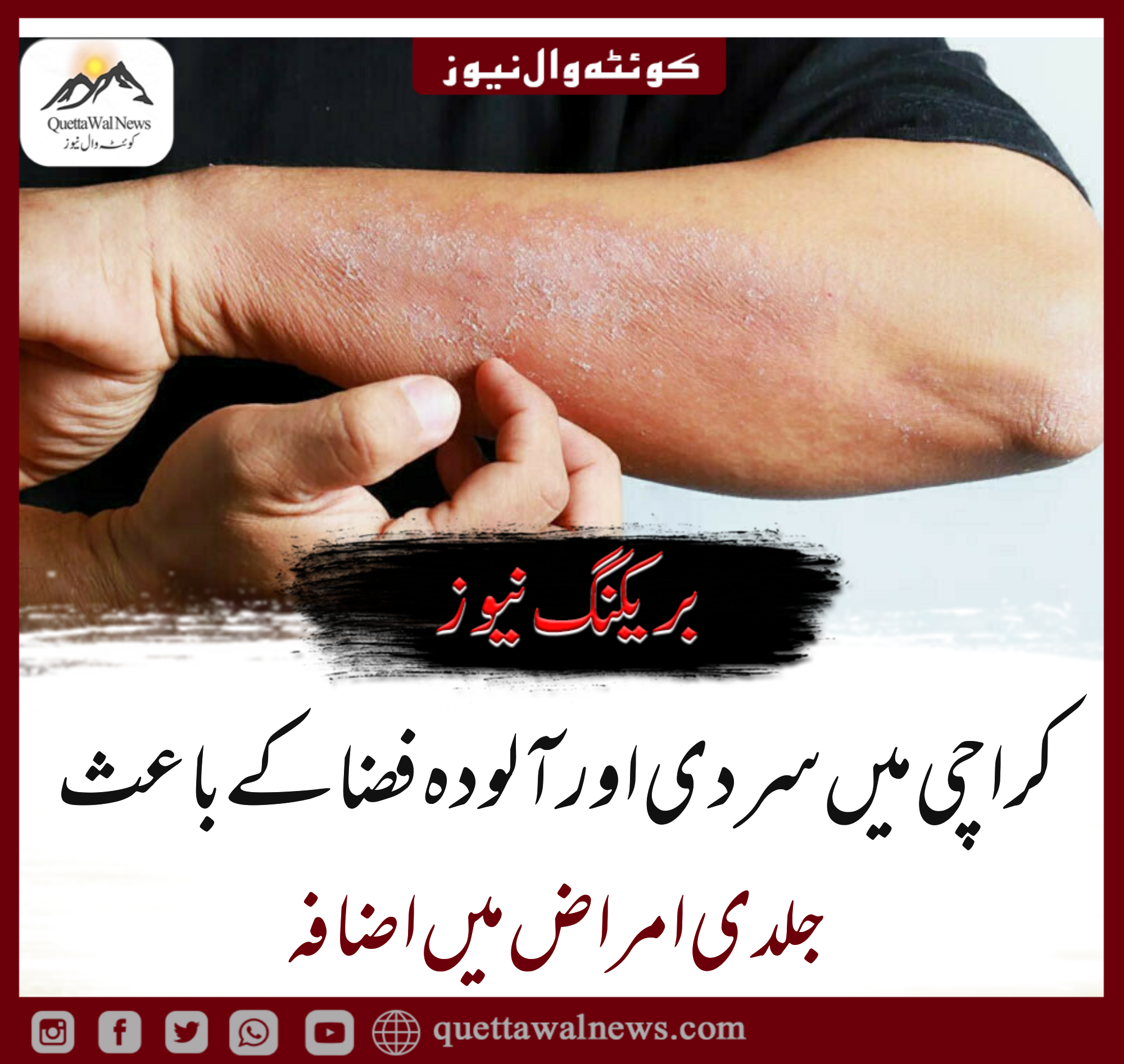 ڈان نیوز کے مطابق کراچی میں سرد موسم اور آلودہ فضا شہریوں کو بیمار کرنےلگی، شہر میں خشک اور سرد موسم کی وجہ سے جلدی امراض میں اضافہ ہوگیا، جلدی امراض کے ہسپتال میں اسکیبیز، سورائسز، ایکزیما کے ہزاروں کیسز رپورٹ ہونے لگے۔