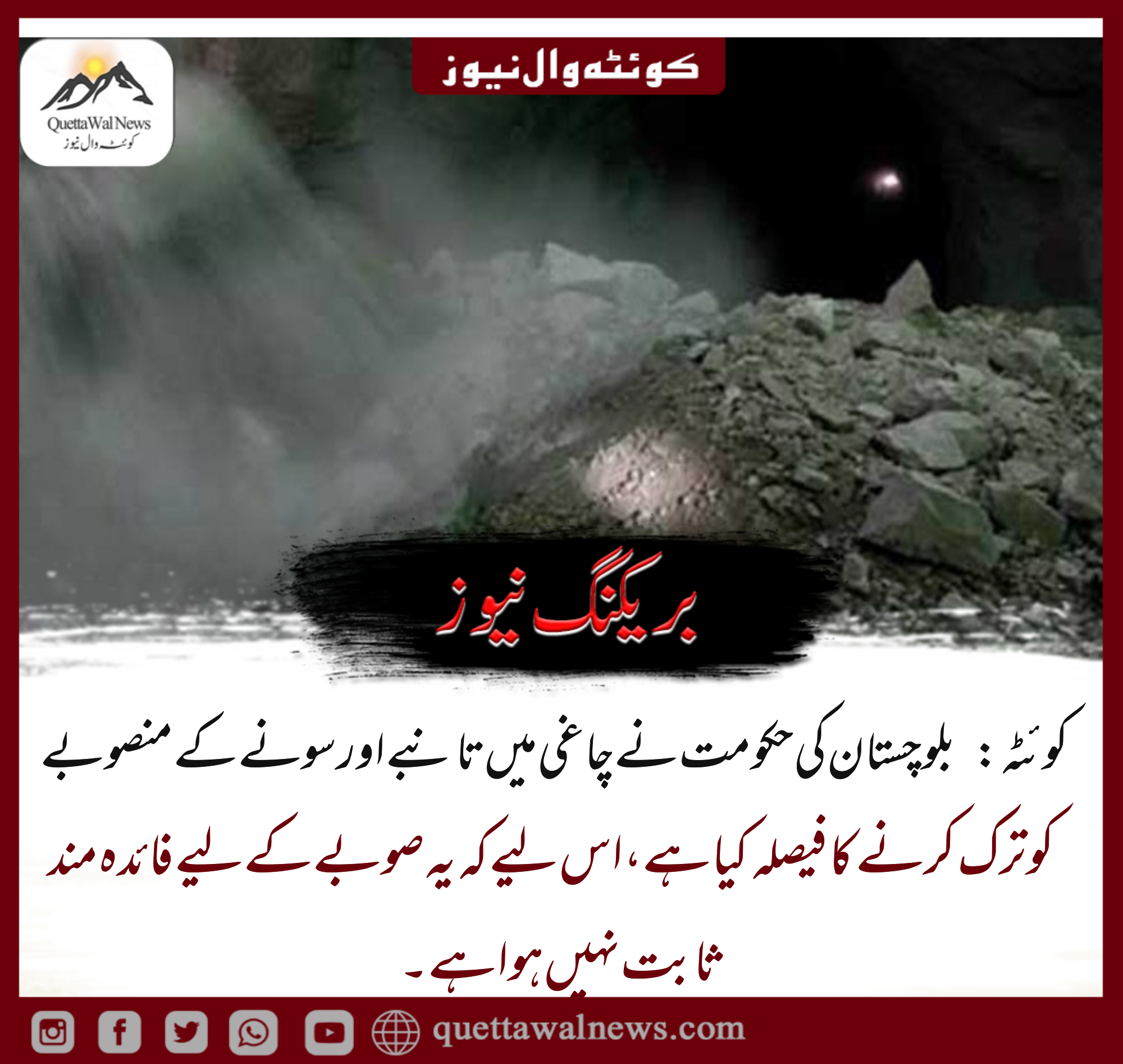 کوئٹہ: بلوچستان کی حکومت نے چاغی میں تانبے اور سونے کے منصوبے کو ترک کرنے کافیصلہ کیا ہے، اس لیے کہ یہ صوبے کے لیے فائدہ مند ثابت نہیں ہوا ہے۔